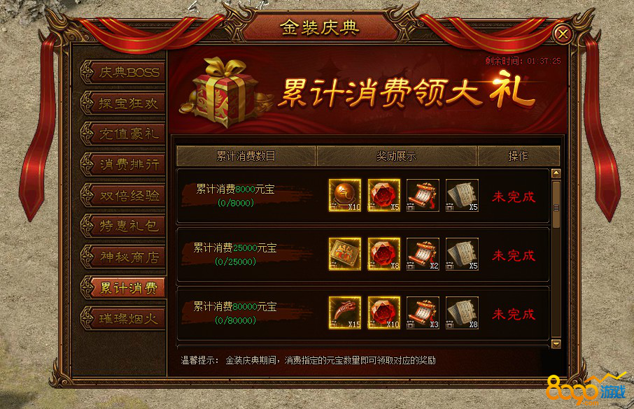 活动内容:活动期间达到累计消费元宝数即可领取大量超值奖励。