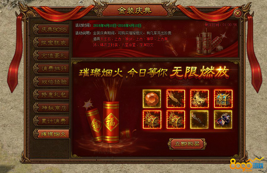 活动内容:活动期间内,可购买烟火,点燃烟火可获得主要奖励有: