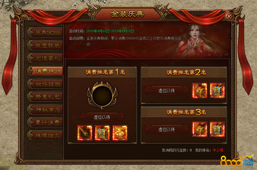 活动内容:活动期间内,本服消费前三可上榜获取对应丰厚奖励!