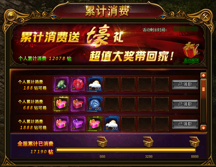 2、活动期间全服总消费每达到一定额度后,所有人均可获得一份免费大礼包。