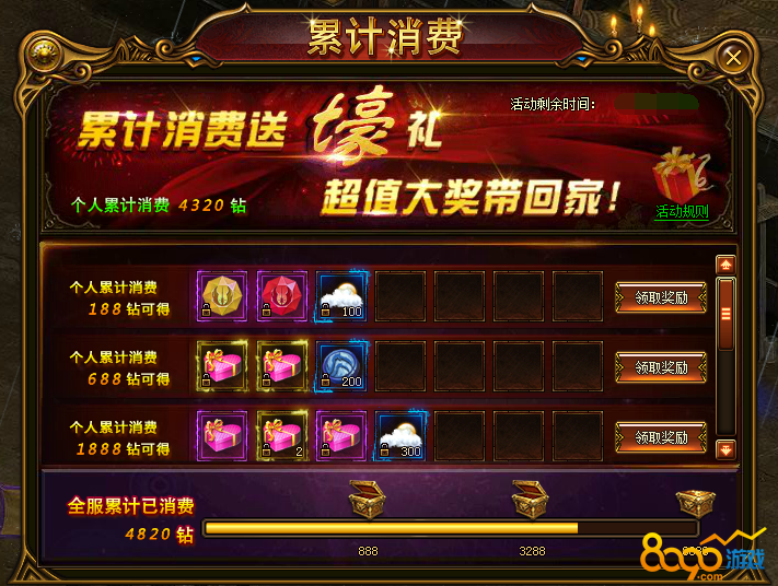 2、活动期间全服总消费每达到一定额度后,所有人均可获得一份免费大礼包。