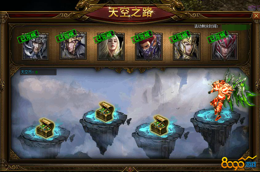 1、玩家可以打开天空之路上遇到的上古宝箱,打开后随机获得天空币和极品道具奖励。