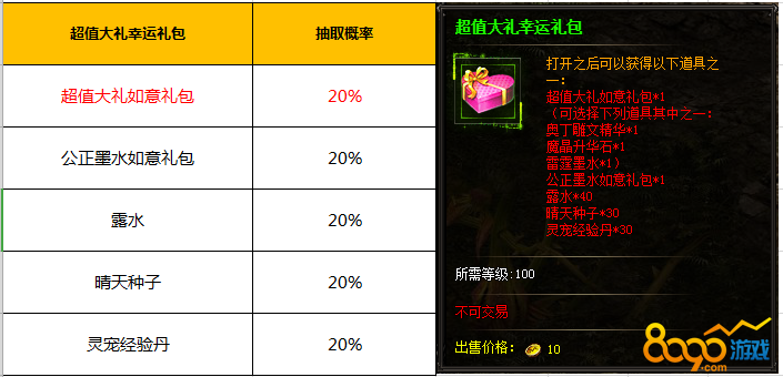 ②超值大礼幸运礼包(打开可随机获得其中之一:超值大礼如意礼包*1、公正墨水如意礼包*1、5露水*1、晴天种子*40、晴天种子*30、灵宠经验丹*30);