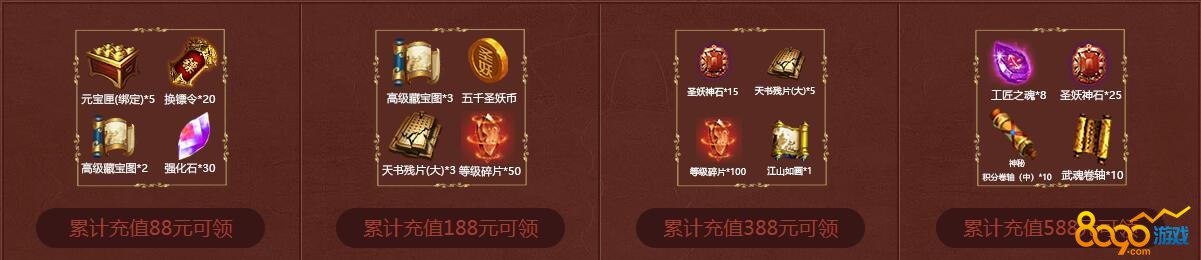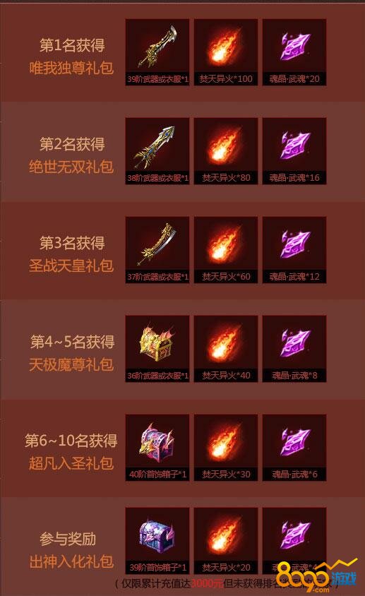 2.充值总额满3000元以上的玩家可参与竞争前十名的高级装备奖励