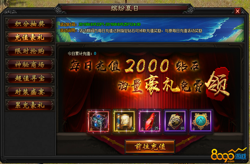 2.2 活动期间内,每日充值达指定钻石数额,即可领取充值奖励,可原每日充值奖励叠加领取
