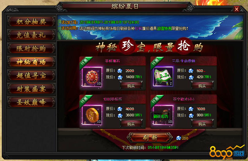• 圣妖传8月22日-25日缤纷夏日活动 神秘商场珍宝限量抢购