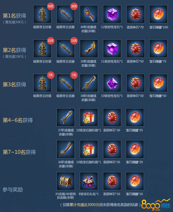 2、充值总额满3000元以上的玩家可参与竞争前十名的高级装备奖励(同一账号不同角色的充值分开计算);