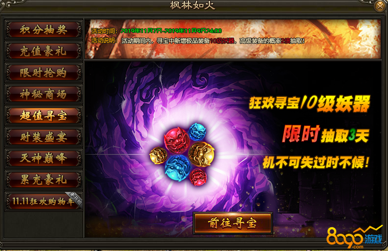 1.活动期间,王之宝藏可抽取妖器装备!高级装备概率翻倍!活动限时3天,机不可失过时不候
