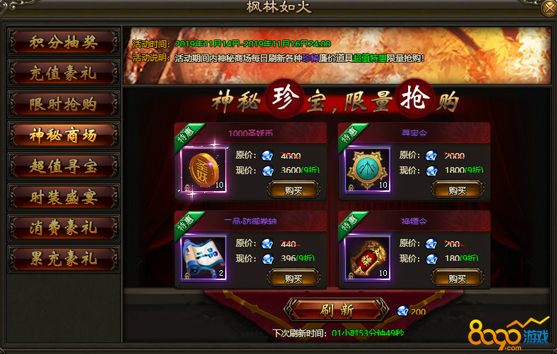 2.活动期间内,神秘商场每日刷新各种珍稀道具,打折出售限量抢购。