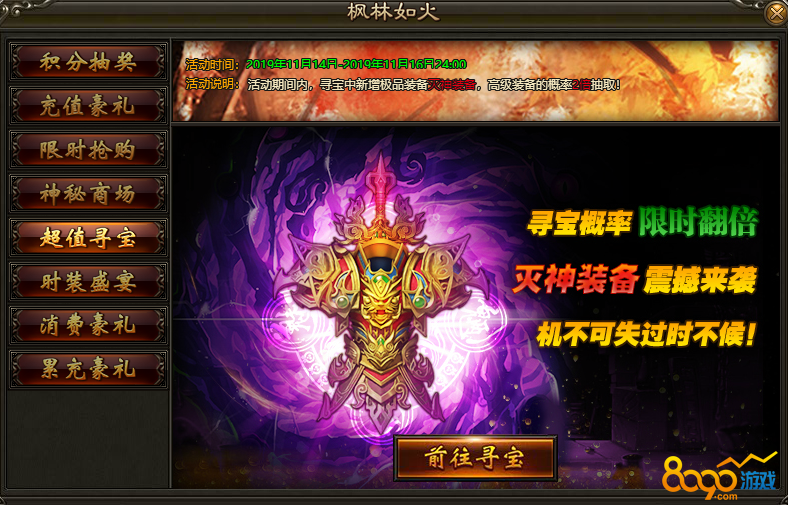 1.活动期间,王之宝藏可抽取妖器装备!高级装备概率翻倍!活动限时3天,机不可失过时不候