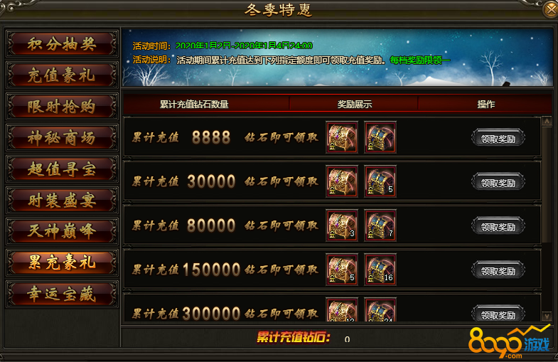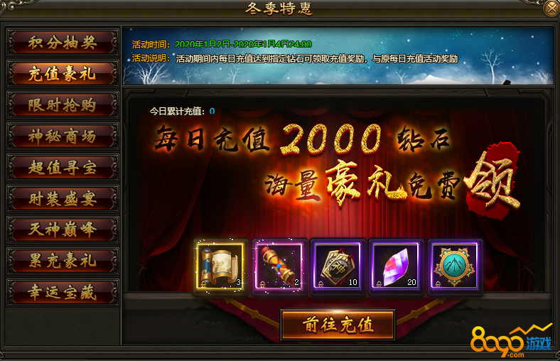 2.活动期间内,每日充值达指定钻石数额,即可领取充值奖励,可原每日充值奖励叠加领取。