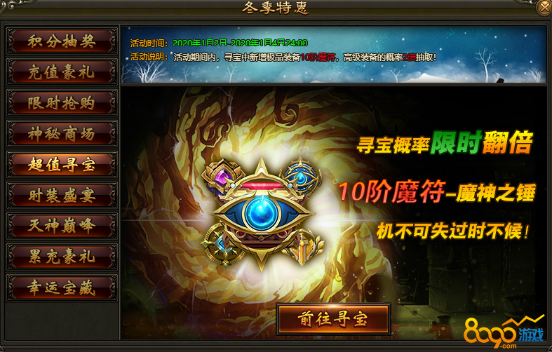 1.活动期间,王之宝藏可抽取妖器装备!高级装备概率翻倍!活动限时3天,机不可失过时不候