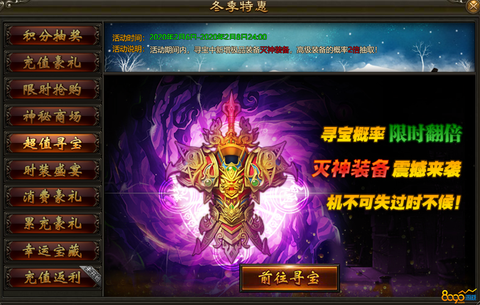 1.活动期间,王之宝藏可抽取妖器装备!高级装备概率翻倍!活动限时3天,机不可失过时不候