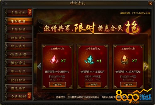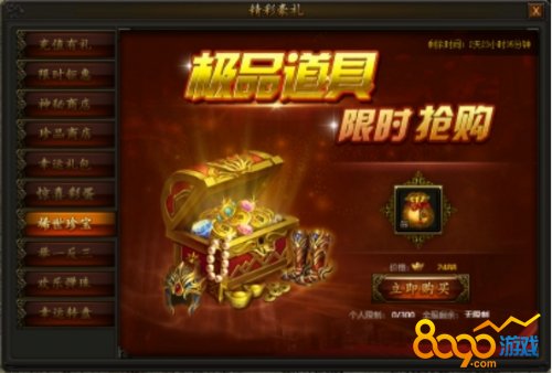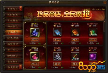活动期间,每天会随机刷新一批特价道具,花费少量元宝即可购买,每个道具均有每天最大个人购买次数限制,部分道具有购买vip等级限制,买到就是赚到,机会不容错过!