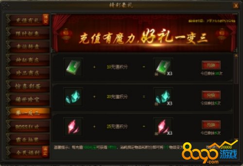 活动说明:活动期间每充值100元宝即可获得1充值积分。使用充值积分可以将一个道具变为3个道具。