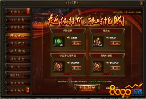 活动期间,每两小时神秘商店会自动刷新一批道具,也可花费元宝立即刷新,大量道具限时等你抢购。