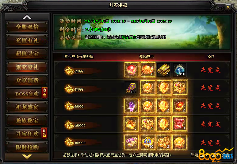 活动说明 : 活动期间内,累计充值指定元宝即可领取海量奖励