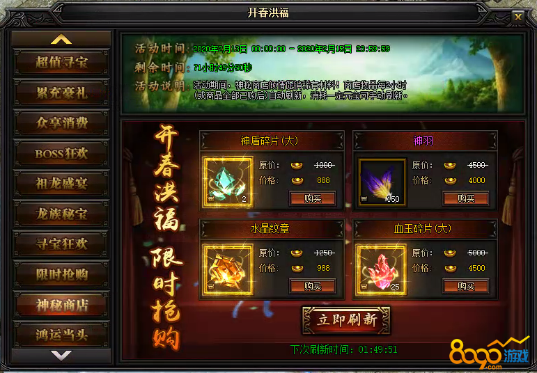 活动说明 : 活动期间,神秘商店倾情促销稀有材料!商店物品每2小时自动刷新(或全商品全部已购后),消耗一定元宝可手动刷新。