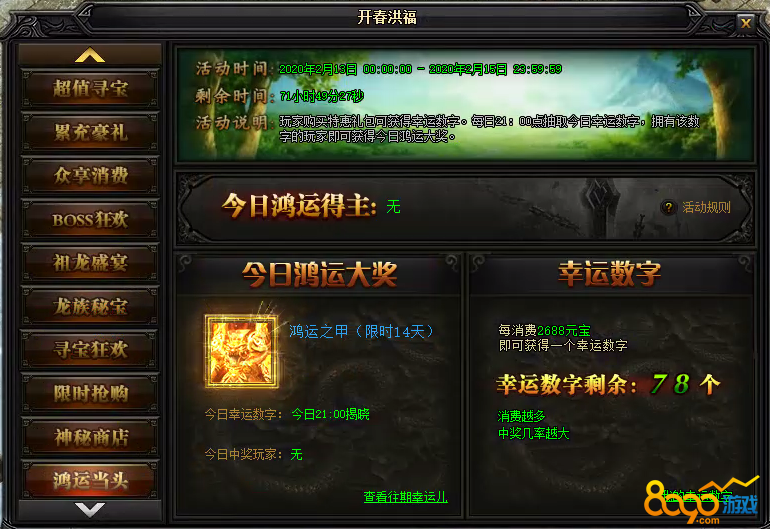 活动说明 : 玩家每消耗2688元宝即可获得一个1-100之间的幸运数字。每日21点抽取今日幸运数字,拥有该数字的玩家即可获得今日鸿运大奖。