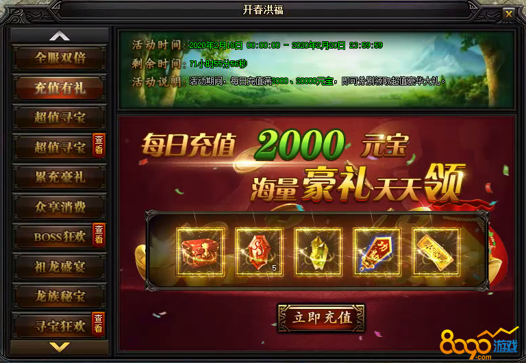 活动说明:活动期间,每日充值满2000、20000元宝!还能领取超值豪华大礼