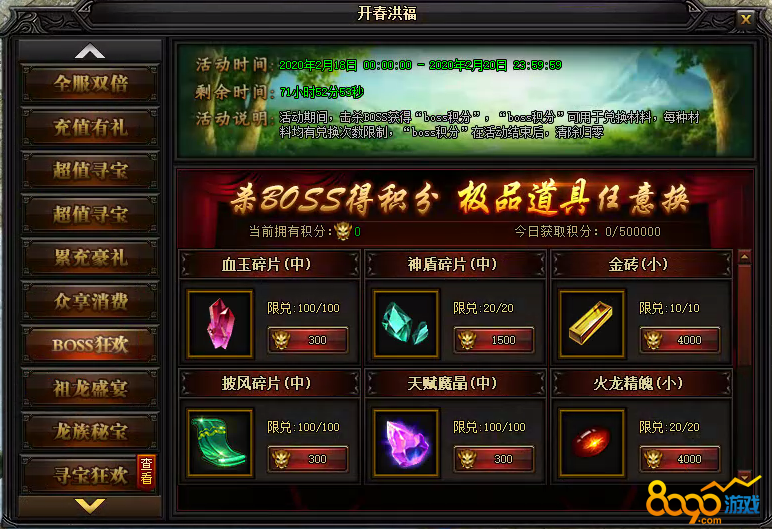 活动说明 : 活动期间内,击杀BOSS获得“boss积分”,“boss积分”可用于兑换材料,每种材料均有兑换次数限制,“boss积分”在活动结束后,清除归零