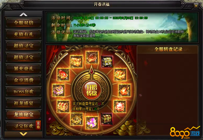活动说明:活动期间,龙族寻宝次数达到指定次数可转动秘宝,转动转盘12次必定可领取所有秘宝转盘道具。
