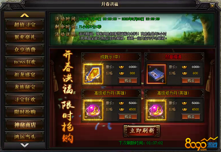 活动说明 : 活动期间,神秘商店倾情促销稀有材料!商店物品每2小时自动刷新(或全商品全部已购后),消耗一定元宝可手动刷新。
