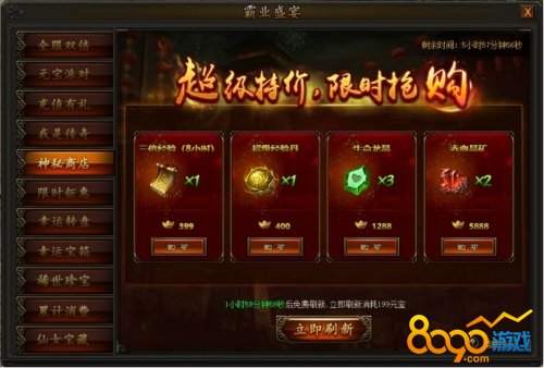 活动期间,每两小时神秘商店会自动刷新一批道具,也可花费元宝立即刷新,大量道具限时等你抢购。