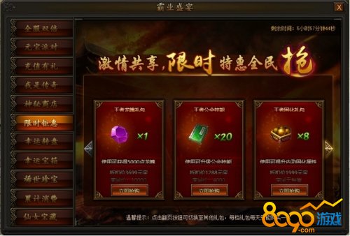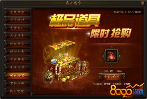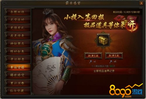 活动期间,80级以上(包含80级)玩家每天最多可购买300次,打开幸运宝箱可随机获得一种道具,多买多得,极品道具等你来开!钥匙可从稀世珍宝中获得。