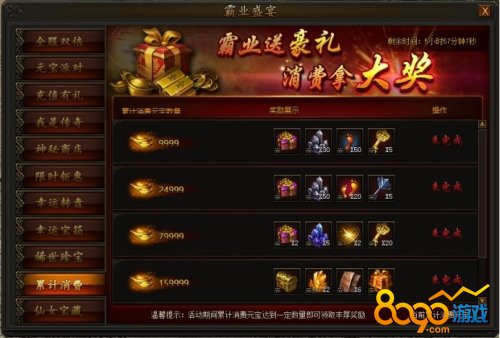 活动期间,累计消费一定数量元宝,即可领取对应档奖励,每个角色只能领取一次。