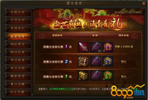 活动期间,累计消费满30w元宝即可参与排行,排行前3名即可获得霸业以及高级转生装备,豪礼不容错过。