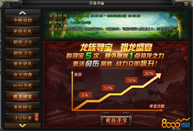 活动说明:活动期间,在龙族寻宝中,每寻宝5次,可额外获得1点祖龙之力,获取无上限!