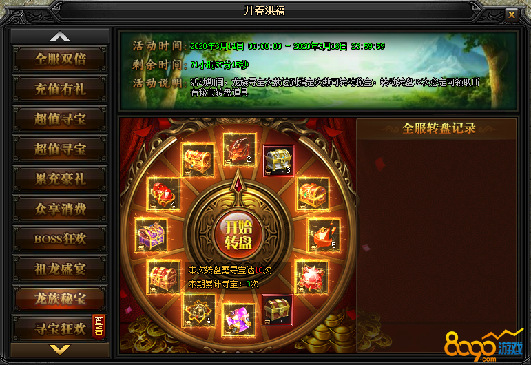 活动说明:活动期间,龙族寻宝次数达到指定次数可转动秘宝,转动转盘12次必定可领取所有秘宝转盘道具。