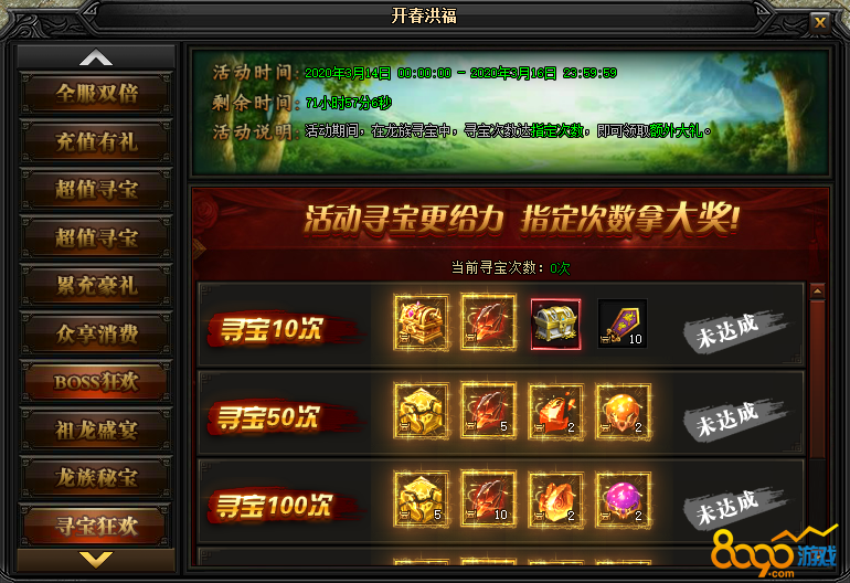 活动说明:活动期间,在龙族寻宝中,寻宝次数达指定次数,即可领取额外大礼。