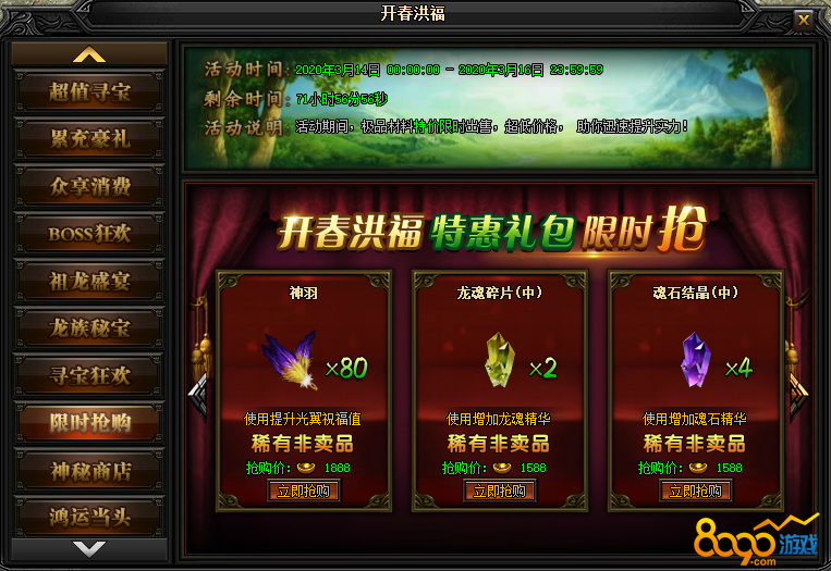 活动说明 : 活动期间,神秘商店倾情促销稀有材料!商店物品每2小时自动刷新(或全商品全部已购后),消耗一定元宝可手动刷新。