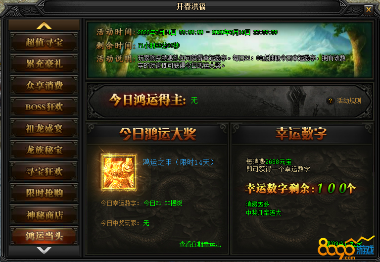 活动说明 : 玩家每消耗2688元宝即可获得一个1-100之间的幸运数字。每日21点抽取今日幸运数字,拥有该数字的玩家即可获得今日鸿运大奖。