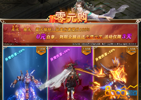 投入元宝即可获得多倍元宝返利,每天有6次机会可参与财神赐福; 充值10元除获得原来一份元宝外,还可额外领取1000不绑定元宝;使用许愿星进行许愿,每次许愿出现1位数字,许愿5次后,完整出现5位数后可领取对应数值的元宝卡。