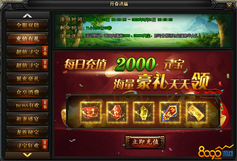 活动说明:活动期间,每日充值满2000、20000元宝!还能领取超值豪华大礼
