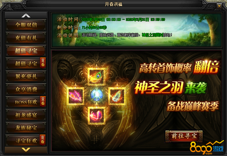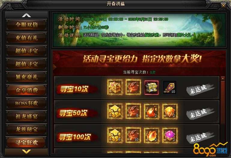 活动说明:活动期间,在龙族寻宝中,寻宝次数达指定次数,即可领取额外大礼。