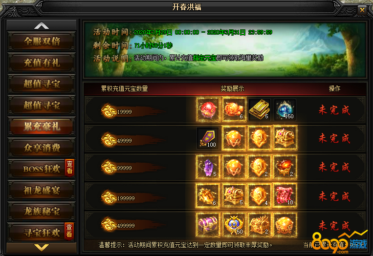 活动说明 : 活动期间内,累计充值指定元宝即可领取海量奖励