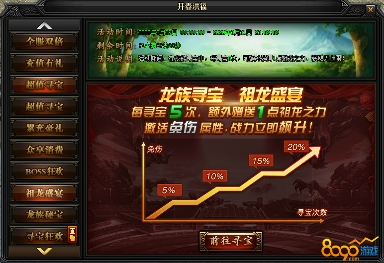 活动说明:活动期间,在龙族寻宝中,每寻宝5次,可额外获得1点祖龙之力,获取无上限!