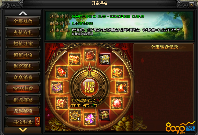 活动说明:活动期间,龙族寻宝次数达到指定次数可转动秘宝,转动转盘12次必定可领取所有秘宝转盘道具。