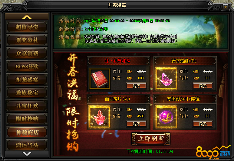 活动说明 : 活动期间,神秘商店倾情促销稀有材料!商店物品每2小时自动刷新(或全商品全部已购后),消耗一定元宝可手动刷新。