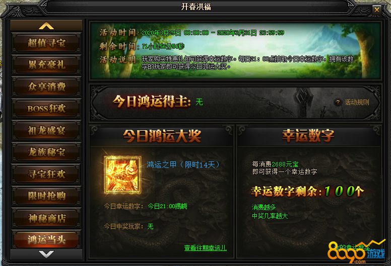 活动说明 : 玩家每消耗2688元宝即可获得一个1-100之间的幸运数字。每日21点抽取今日幸运数字,拥有该数字的玩家即可获得今日鸿运大奖。