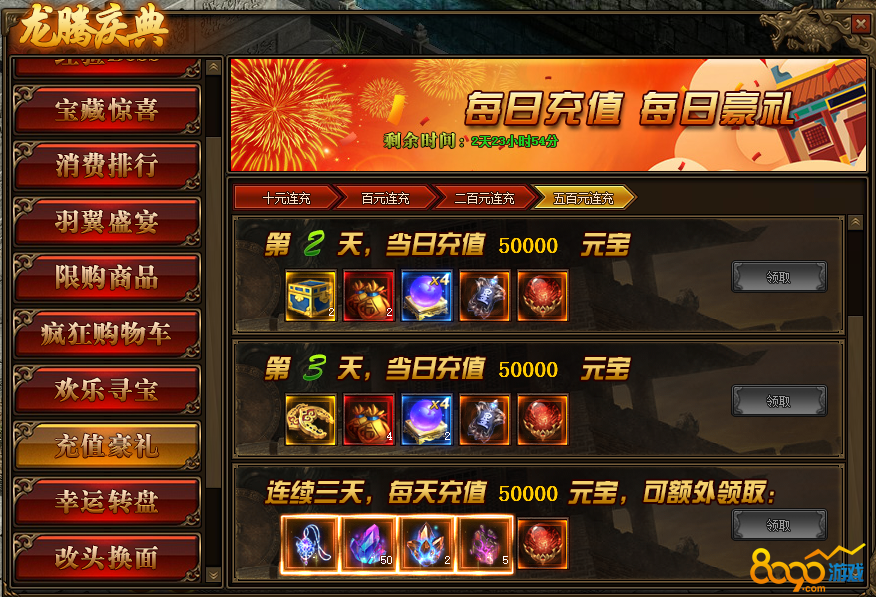 2.连续充值达到3天,奖励翻倍领,更可领取暗影晶石、地狱晶石、随机7级阵法宝珠、雷霆装备等贵重物品