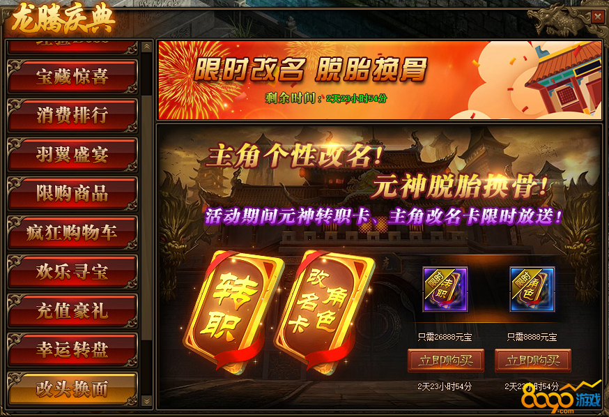 1.活动期间,玩家可在活动面板中购买元神转职卡,让元神脱胎换骨;