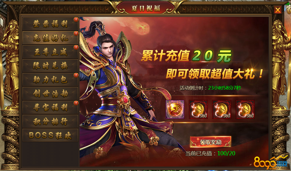 1.活动期间,玩家每日充值20、200、500元,均可领取超值大礼;