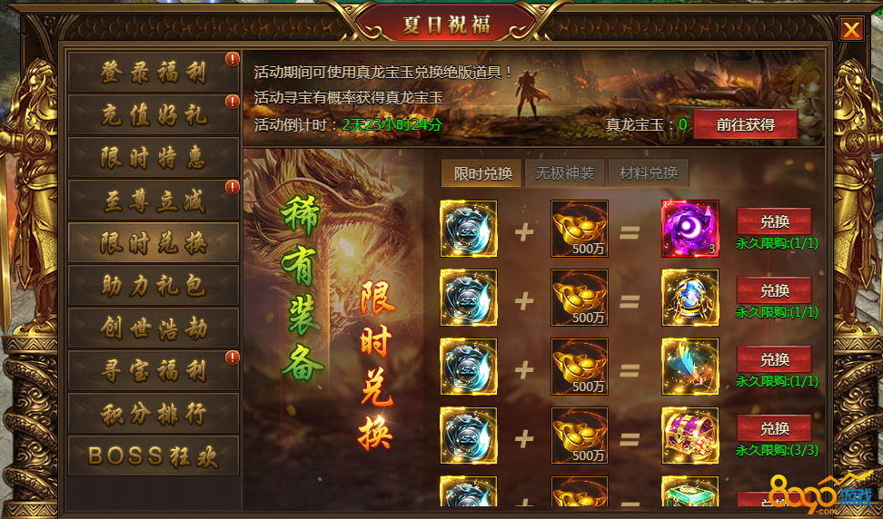 活动内容:活动期间可使用真龙宝玉兑换绝版道具