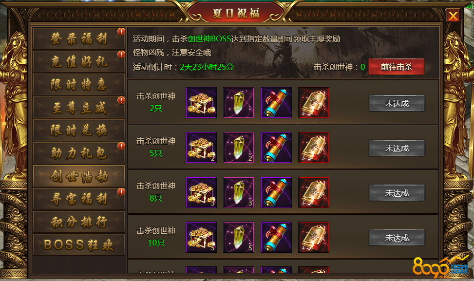 1.活动期间击杀指定数量的创世神即可获得奖励