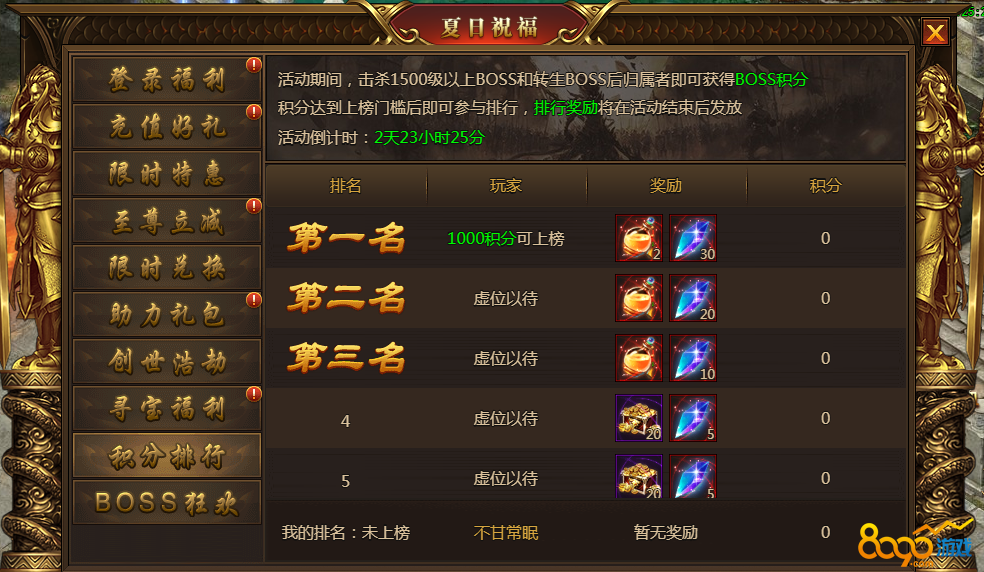 1.活动期间击杀1500级以上的boss和转生boss获得积分,活动结束后更加排行邮件发送奖励